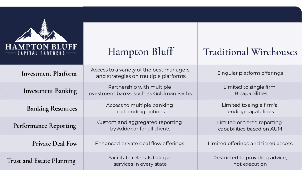 The comparison to ‘Traditional Wirehouses’ is provided for illustrative purposes only and represents a generalized characterization of the industry; actual services, fees, and capabilities at other financial institutions may vary. Hampton Bluff Capital Partners and Elevation Point Wealth Partners, LLC are not law firms, banks, or lenders. Statements regarding ‘legal services’ refer to our ability to coordinate with independent third-party attorneys or estate planning firms. Lending and investment banking solutions are accessed through unaffiliated third-party partners and are subject to separate terms, credit approval, and underwriting.
